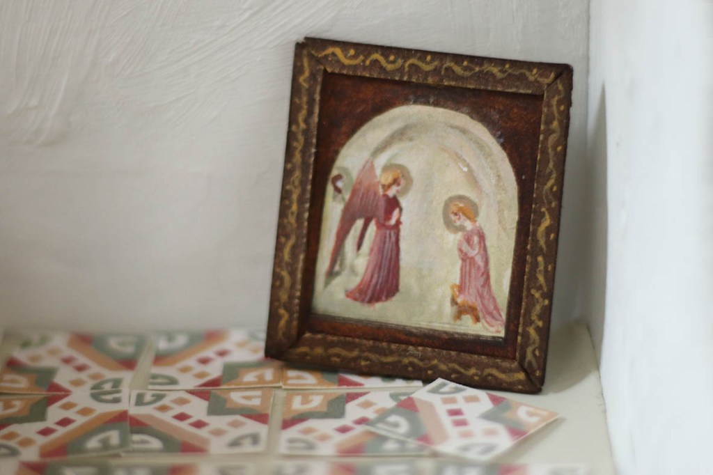 J’ai réalisé une miniature de l’Annonciation de Fra Angelico. Ou plutôt de la reproduction encadrée dont j’ai hérité. À l’époque où on me l’a donnée, personne ne semblait accorder autant que moi de valeur à ce cadre. Son origine reste mystérieuse. Comment est-il arrivé dans la chambre de Corbera ? J’aime penser que c’est mon arrière grand-père qui l’a rapporté d’Italie lorsque qu’il a émigré en Corse, même si l’idée de s’encombrer d’un tel objet au cours d’un tel voyage me paraît suspecte. Il n’avait pas trente ans, il venait de perdre sa femme, et ce tableau, peut-être, le reliait à elle. Auraient-ils été ensemble à Florence ? Quand Pauline et Louis ont quitté la Corse pour Paris, il était naturel que L’Annonciation les suive. J’aime penser qu’elle était installée à Corbera quand Antoine y a vécu, et qu’il s’est interrogé, lui aussi, sur son origine.