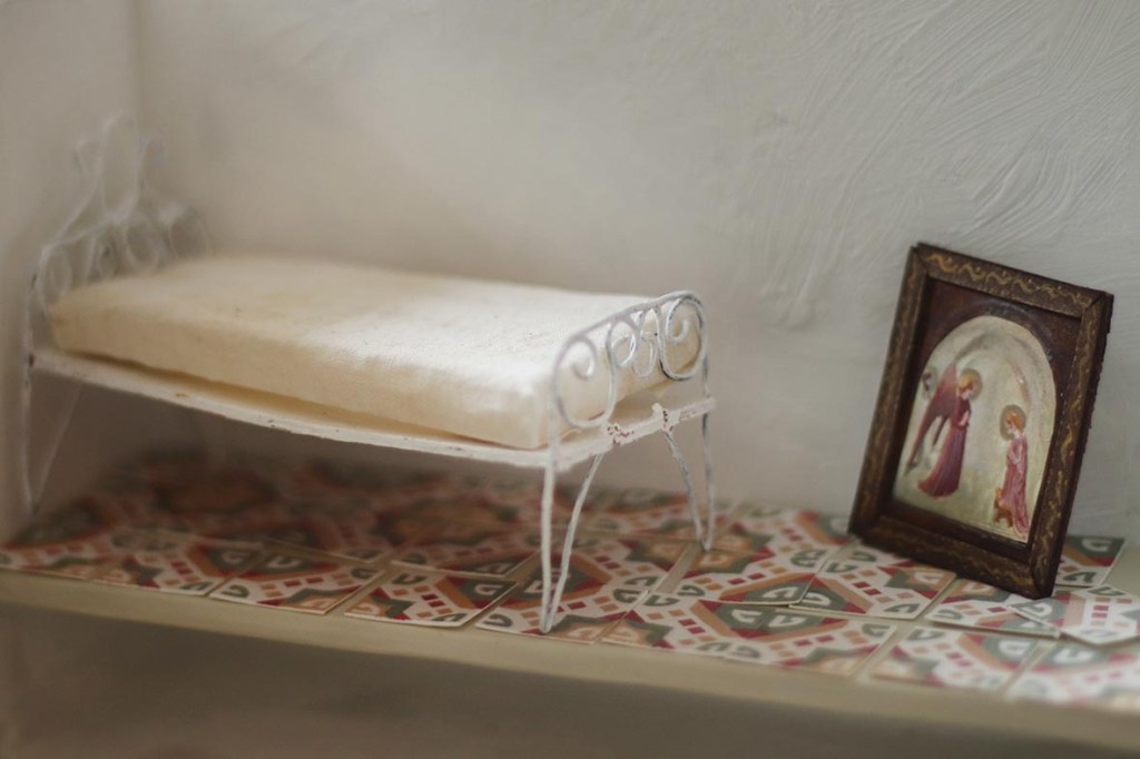 J’ai disposé dans la valisette, dont j’ai peint l’intérieur pour évoquer la chaux d’Erbalunga, le minuscule lit en métal qui m’a donné tant de fil à retordre, les carreaux de ciment, la reproduction du Fra Angelico, les fragments de souvenirs. Elle est prête à accueillir les voix.