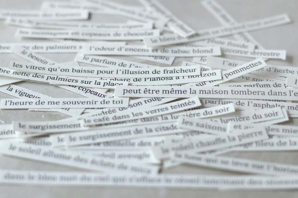 Je continue mes expériences de cyanotypes et de gravure mixés. Je joue au petit chimiste avec du café pour faire virer ce bleu cyan que je n’aime pas beaucoup, puis avec du bicarbonate pour altérer les images. J’aime ces moments où l’image n’existe pas encore, où elle se révèle, s’estompe, où les teintes se transforment. Parfois je vais trop loin et tout tend à disparaître. En parallèle, le texte se matérialise sur des bandelettes de papier bouffant. Il pourrait bien venir dialoguer avec les images.