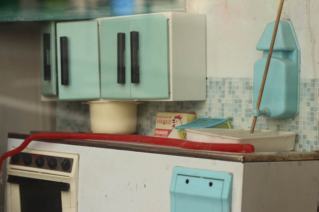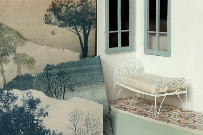 Grande avancée de la miniature, le leporello est terminé. Il me reste à plisser le tissu des rideaux, fabriquer le couvre-lit, finir l’armoire, accrocher les volets, poser des poignées aux fenêtres, aux portes, aux tiroirs, peindre le motif du couvercle de la valisette. Peut-être aurai-je le temps de fabriquer la chaise au coussin rouge. Reconstituer ce lieu est encore plus exaltant que je ne l’avais imaginé. Je découpe, je remonte, je fais tenir ensemble des traces, je suis danseuse, pêcheuse à l’aimant, archiviste. (Ce n’est que le début).