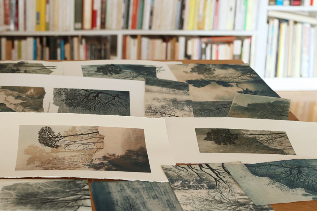 Je fais des choix. J’assemble des fragments. Ce n’est que le début de quelque chose. J’ai repris mes textes sur la Corse et les murmurantes. J’ai imprimé puis découpé des fragments, ils glissent entre mes mains. Je les place en regard de mes cyanotypes et de mes gravures. Les images répondent aux phrases. Maintenant il y a d’autres débuts.