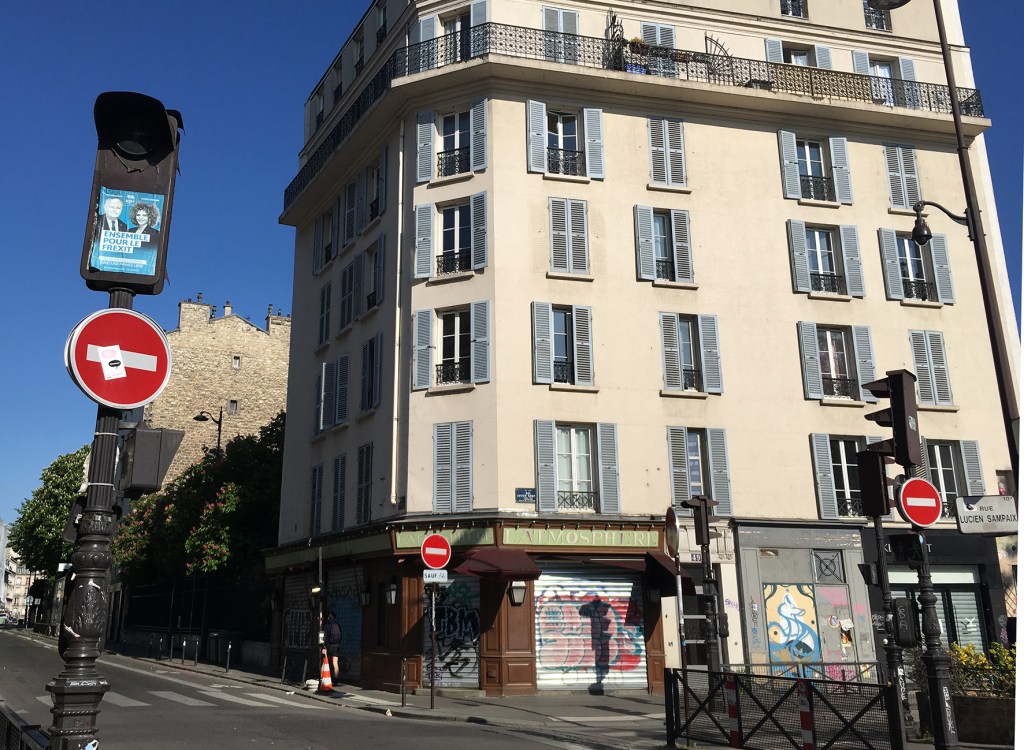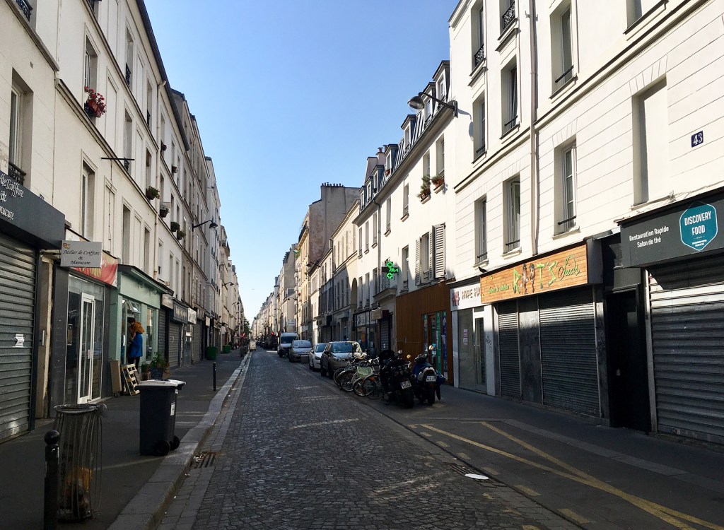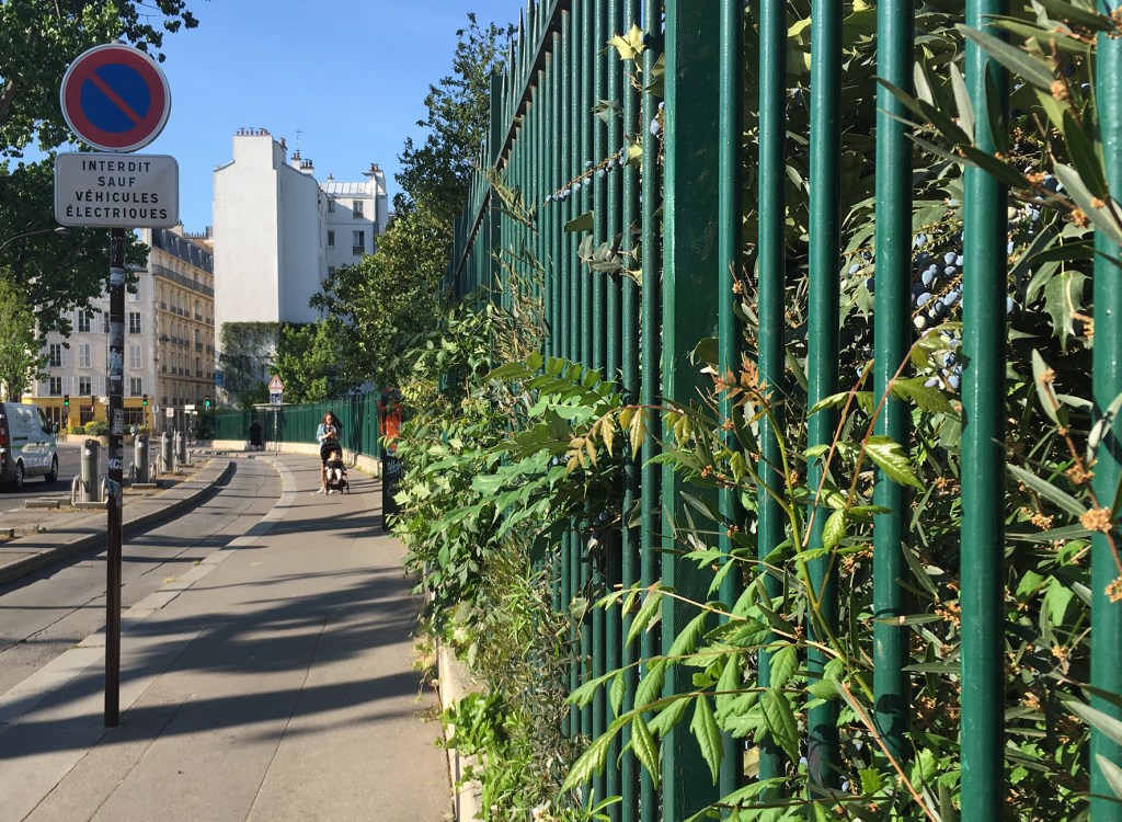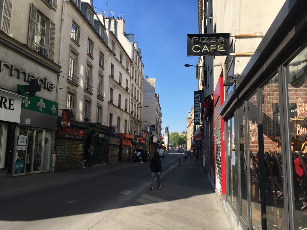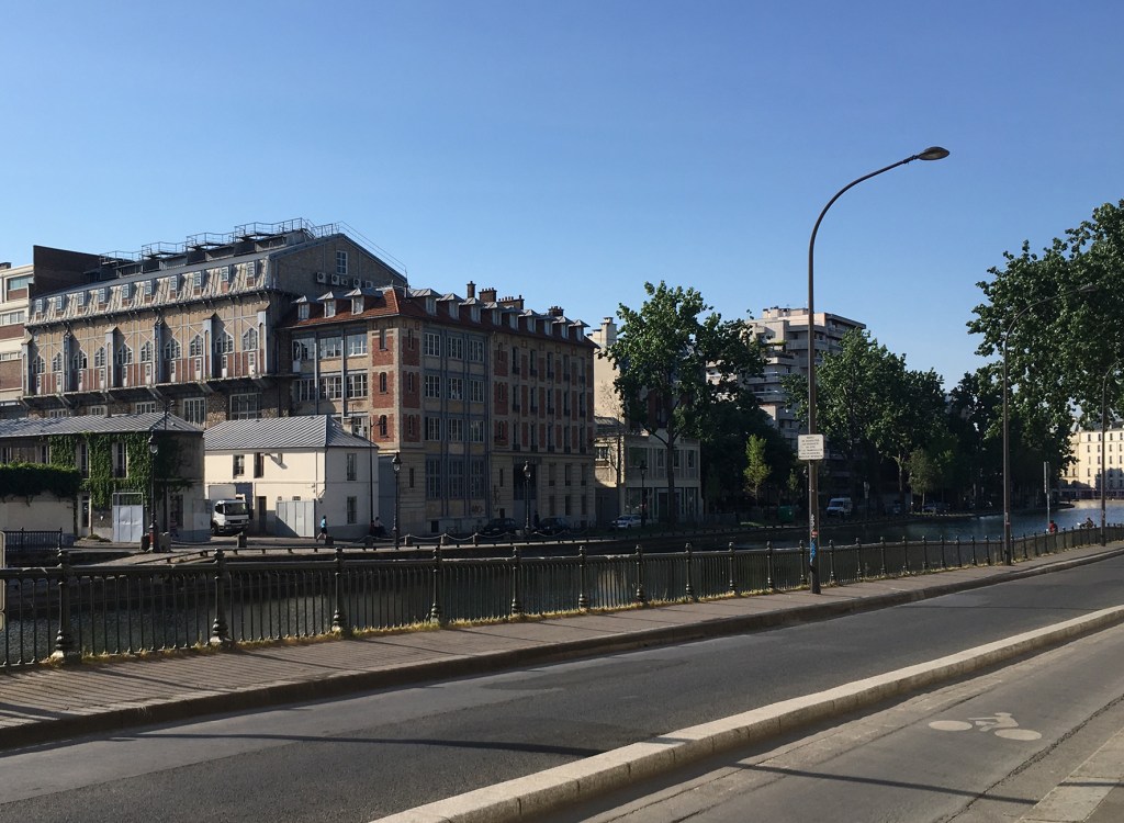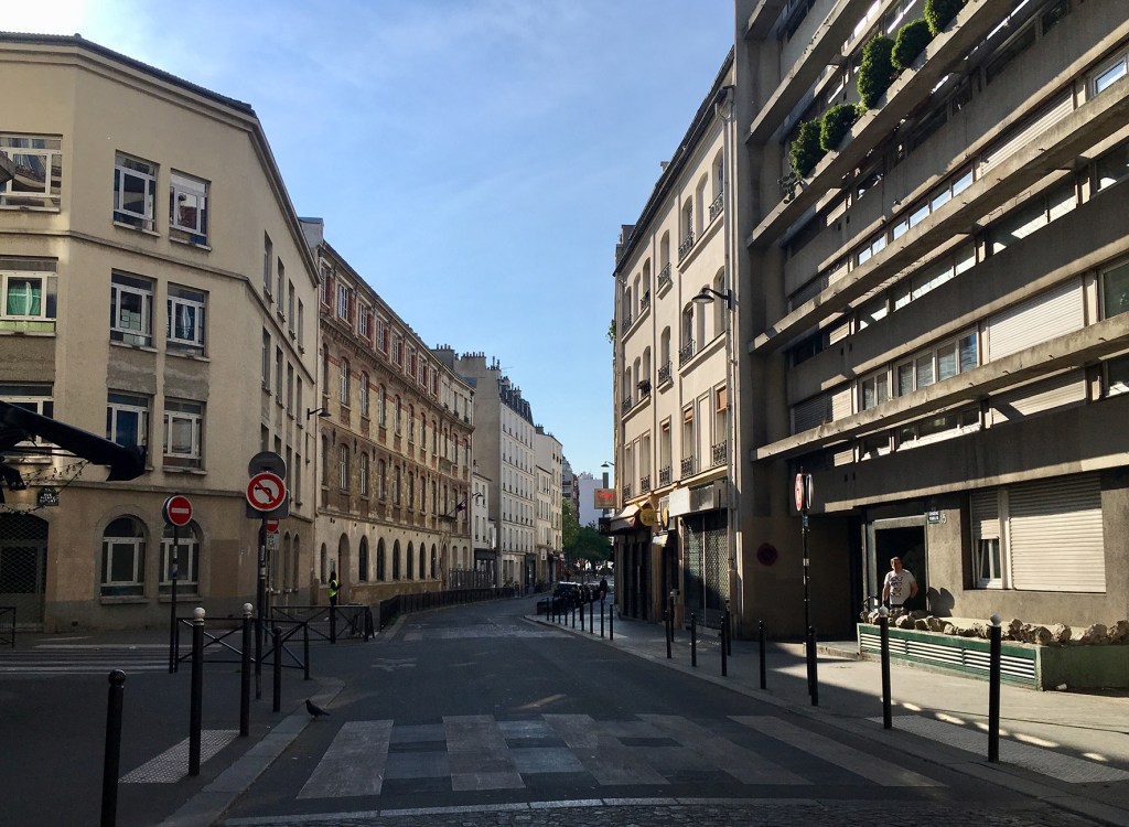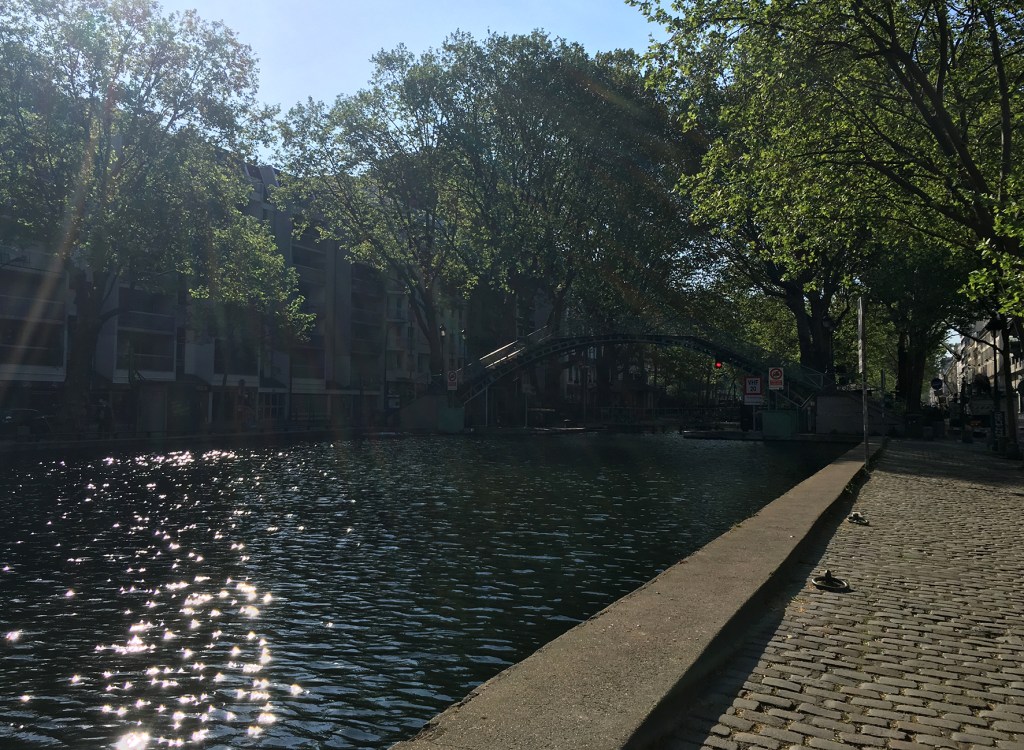 En sortant de l’immeuble la grille qui en protège l’accès paraît très imposante, plus qu’à l’habitude, effet secondaire, dehors je respire, l’air frais, des immeubles ouvriers, un haussmannien égaré, des bâtiments plus modernes de la fin des années soixante-dix quatre-vingt, la rue dessine un léger arrondi avant de rejoindre le canal, je passe devant l’ancienne école des filles, jette un œil à la boulangerie d’en face, fermée depuis des mois, bien avant le dix-sept mars, la librairie du canal éclairée, la gérante s’affaire, un promeneur de chien, un cycliste, deux joggers, l’éblouissement sur le quai de Valmy, inondation de soleil, je tourne à droite, longe le canal en légère descente, vérifie la présence de la fabrique Exacompta, briques verres petits carreaux, miroir, square Raoul Follereau souvenirs de jeux autour de la fontaine, plus d’eau depuis longtemps, de l’autre côté la Gare de l’Est, le faubourg, je ne les vois pas, le terrain redevient plat, la végétation du jardin Villemin pousse à travers les barreaux verts, la pelouse bosselée épaisse, désertée, qu’on aurait envie de se coucher dessus, nature à la fête qu’ils disent, le canal se courbe, les arbres denses, frondaisons frissonnent, couleurs acidulées, passerelles, la beauté du matin à l’angle de la rue des Vinaigriers, pont tournant, façade vermillon, en arrière les graffitis du mur de la rue Jean Poulmarch, la cour silencieuse de l’école rue de Marseille, une échappée, tente posée au bord de l’eau, scintilllement, canal sous-terrain, élagueurs, bois éclaté sur bitume, je croise la rue du faubourg du Temple, à droite la République, Jules Ferry, plus de lumière, arbres bas, ombre nette, articles pour plombier, tampons, restauration, peinture, mercerie en gros pour l’industrie du prêt à porter, je traverse la rue de Crussol et je pense à notre ancien appartement de la rue de Malte, la façade du Bataclan mais pas de fleurs, plus de fleurs, brèche, passage Saint-Pierre Amélie — incitation à l’errance, sage, file d’attente longue devant le bureau de poste du boulevard Richard Lenoir, des bénévoles de la Croix-Rouge distribuent du café aux SDF, bruit de moteur boulevard Voltaire, je m’interroge sur l’avenir des escape game après le confinement, flèches dans le bleu du ciel, je prends par la rue Popincourt, croise l’impasse Truillot, la rue de l’Asile-Popincourt, le passage de l’Asile, la rue du Chemin-Vert, la villa Marcès, l’impasse Popincourt, l’impasse des Trois-Sœurs, le passage Lisa, la rue Sedaine, la villa Nicolas de Blegny, la rue devient Basfroi, familiarité, élan, retrouver Charonne, le Pause-café fermé, déserté, la rue partagée, sous le vent haut, choisir la lumière, le cri de la mouette de l’Arsenal.