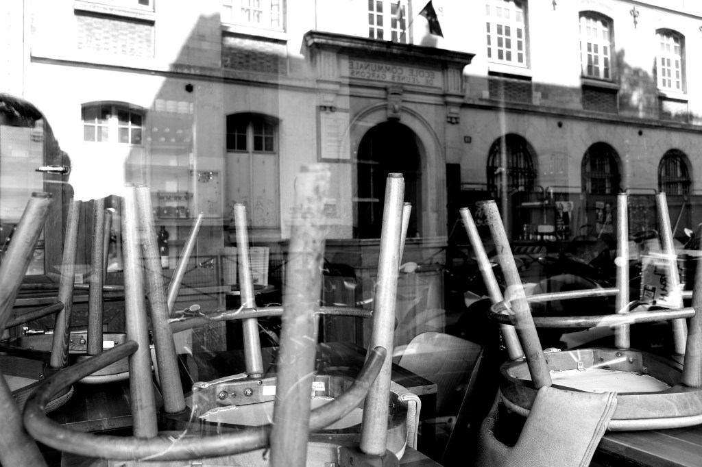 Dans la brasserie fermée entre les tables couvertes de chaises, trois petites filles s’agitent derrière la baie vitrée, je les distingue seulement, l’école où elles se retrouvent habituellement se reflette dans les vitres ensoleillées. Les deux plus grandes dansent, leurs bras dessinent des arcs fous dans l’espace, leurs doigts se tendent vers un public imaginaire pendant que leurs hanches se balancent, la troisième, plus jeune, comme souvent mise à l’écart, saute à la corde, je devine leurs petits cris, leurs chants en yaourt, leurs rires qui résonnent dans la salle de restaurant devenue salle de jeux, je me souviens qu’avant que ça devienne une brasserie au chic raté on y mangeait un couscous familial assez ordinaire. Ressurgit un souvenir d’enfance, joyeux, la fierté qui s’empare quand dans la salle du restaurant que Jacques et Eugénie eurent l’idée saugrenue d’ouvrir dans le Cotentin — ils l’avait nommé Le Village, clin d’œil aux origines corses d’Eugénie — un soir mon institutrice était venue diner avec son jules, j’avais servi le vin, en faisant tourner légèrement la bouteille sur elle même, un geste de sommelier que Jacques m’avait appris, pour que la petite goutte s’agrippe au goulot et n’entache pas la nappe. Rien ne me semblait plus merveilleux que cette salle de restaurant dans laquelle je pensais évoluer avec talent, du petit haut de mes neuf ans, m’inquiétant du bonheur de Mademoiselle Lefranc, l’institutrice, le cœur battant de découvrir son secret amoureux, me glissant entre les tables drapées de coton rose, portant avec courage les trop lourdes assiettes de grès caramel garnies de plats en sauce, m’enorgueillissant d’être la fille de la maîtresse des lieux.
