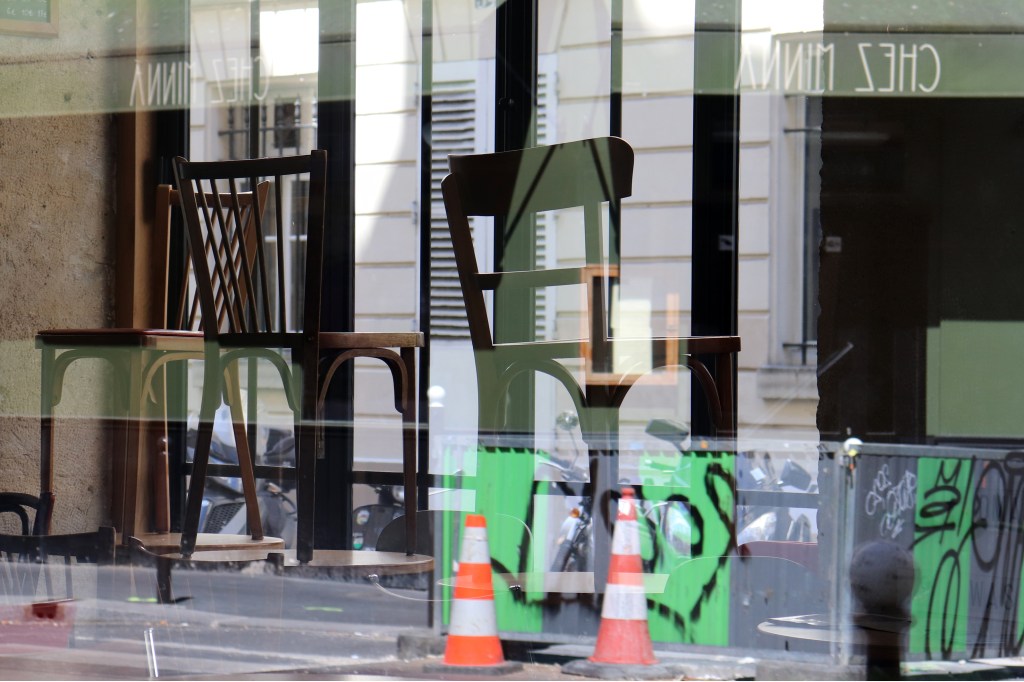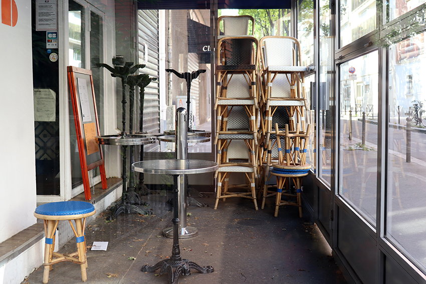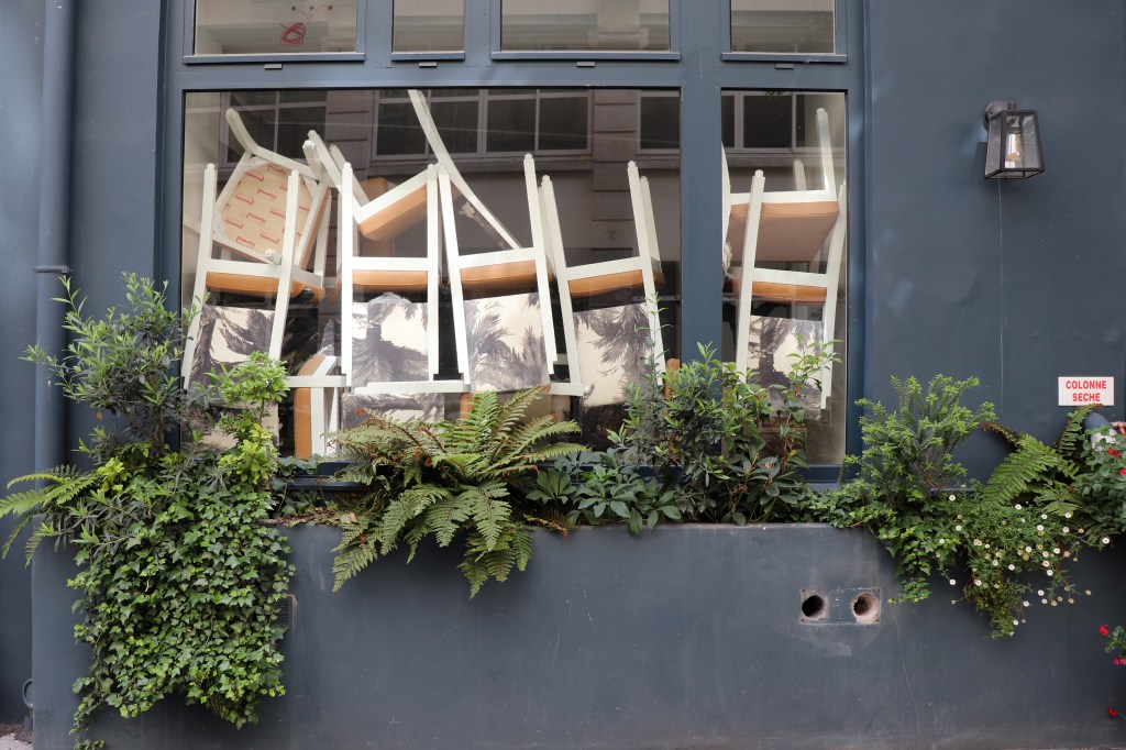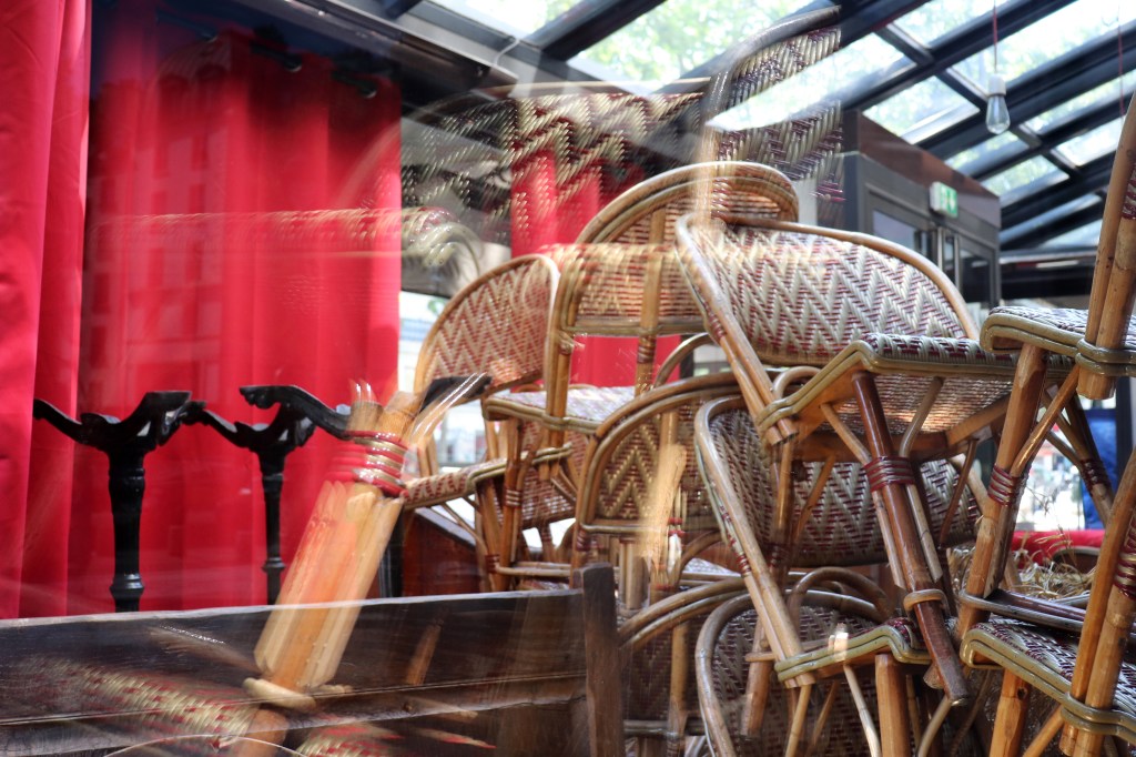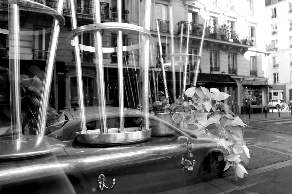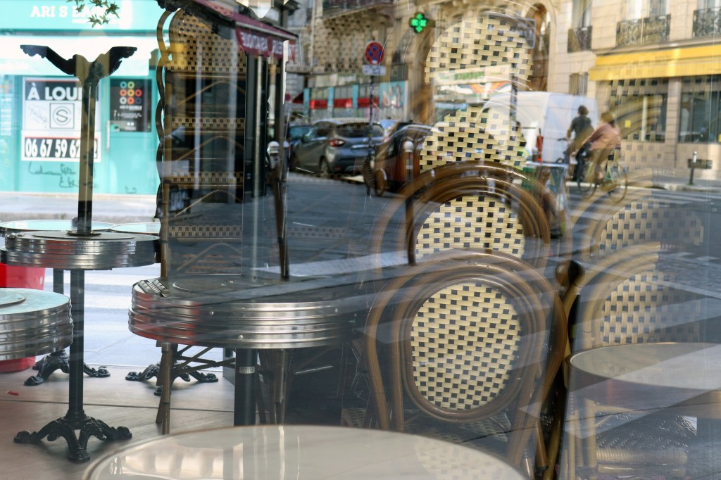 Cette série photographique est née pendant le confinement. À l’origine il y avait la photo du Robinet d’or — une brasserie dans la rue où nous habitons — prise pour documenter un texte sur trois petites filles qui en avait fait leur espace de jeu à ce moment où le dehors était considéré si dangereux. Lorsque je l’ai publiée, François Bon la commente, il y voit une référence à Uccello, je regarde alors la photo comme un tableau, découvre rétrospectivement ce qui m’avait attirée, le jeu graphique des pieds de chaises à la renverse, le silence après la bataille, le vide, qui se répète sans doute ailleurs, partout, dans la ville déserte. Je pars en quête de ces batailles qui se jouent dans les cafés fermés — elles ont lieu dans le secret de la nuit — au matin je n’en retrouve que les vestiges figés, meubles retournés, empilés, pieds en l’air qui s’élancent, débris et poussière au sol. Alors que Paris semble avoir du mal à contenir ses habitants, je colle mon front aux vitres des cafés désertés, découvre un monde endormi dedans, un silence assourdissant quand la ville s’essaie à la vie d’après, puisque nous sommes maintenant appelés à reprendre la vie d’avant mais autrement.
