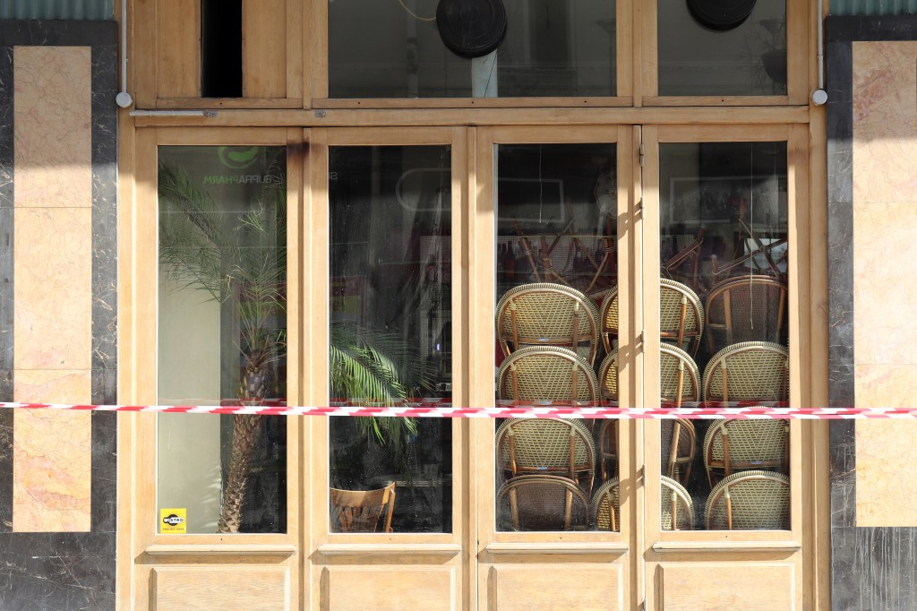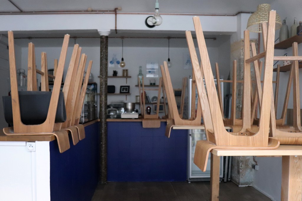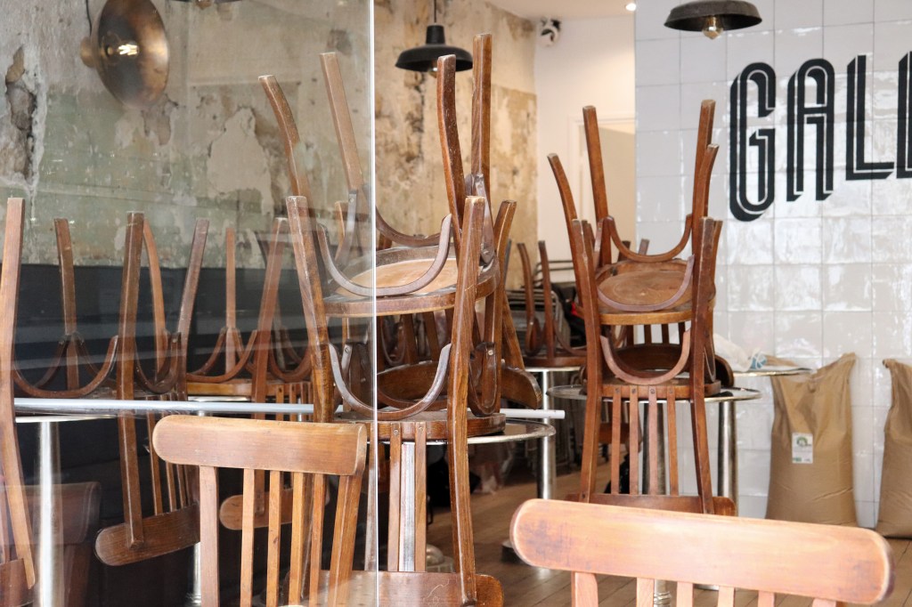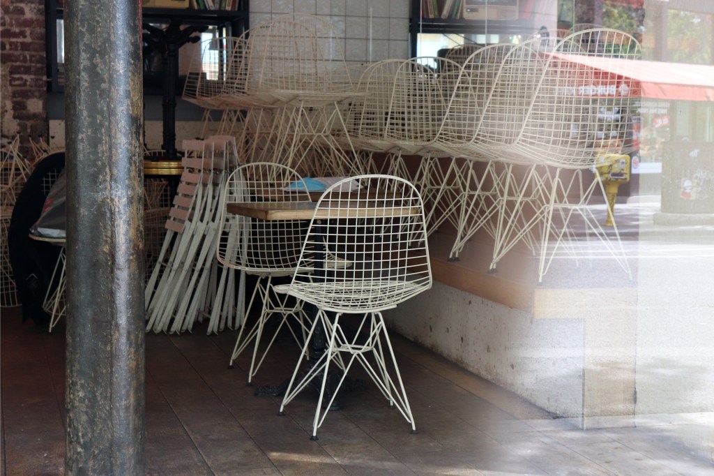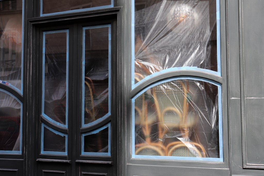 Cette série photographique est née pendant le confinement. À l’origine il y avait la photo du Robinet d’or — une brasserie dans la rue où nous habitons — prise pour documenter un texte sur trois petites filles qui en avait fait leur espace de jeu à ce moment où le dehors était considéré si dangereux. Lorsque je l’ai publiée, François Bon la commente, il y voit une référence à Uccello, je regarde alors la photo comme un tableau, découvre rétrospectivement ce qui m’avait attirée, le jeu graphique des pieds de chaises à la renverse, le silence après la bataille, le vide, qui se répète sans doute ailleurs, partout, dans la ville déserte. Je pars en quête de ces batailles qui se jouent dans les cafés fermés — elles ont lieu dans le secret de la nuit — au matin je n’en retrouve que les vestiges figés, meubles retournés, empilés, pieds en l’air qui s’élancent, débris et poussière au sol. Alors que Paris semble avoir du mal à contenir ses habitants, je colle mon front aux vitres des cafés désertés, découvre un monde endormi dedans, un silence assourdissant quand la ville s’essaie à la vie d’après, puisque nous sommes maintenant appelés à reprendre la vie d’avant mais autrement.