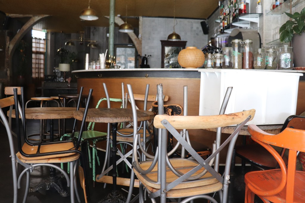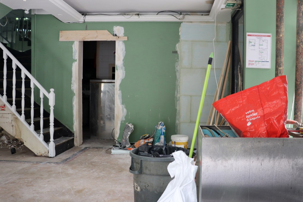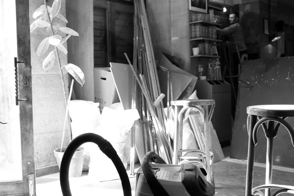 Les jours suivant au cours de mes promenades, ou de mes trajets vers l’atelier, je prends des chemins détournés pour découvrir des lieux inédits, je photographie chaque café dont je peux saisir le désordre et l’abandon, fascinée par les ruines, le temps en suspens qui se révèle, l’entremêlement des matériaux, bois, brun, acajou, vernis, blanchi, métal, osier, cuir synthétique, velours. La matière picturale ne se livre pas toujours au regard, les reflets sur les vitres troublent la vision, difficile de deviner l’intérieur dans le sombre du café. Je colle l’objectif à la vitre, déclenche, alors se révèlent pêle-mêle le désordre, les couleurs, les bois de chaises, les ustensiles, bouteilles et torchons. Devant certains cafés, des terrasses vides comme des zones de défense, je sursaute, surprise par un sans-abri endormi. Si le café est ouvert je demande si je peux photographier l’intérieur, je sens la gêne de l’employé — c’est que c’est un sacré foutoir là-dedans, et puis le gérant n’est pas là, oui justement c’est ce qui m’intéresse. Dans les faubourgs, des groupes se forment devant le café fermé, reproduisent au dehors la communauté qu’ils formaient dedans, debout ou en appui sur quelques tabourets hauts, heureux de renouer un lien.