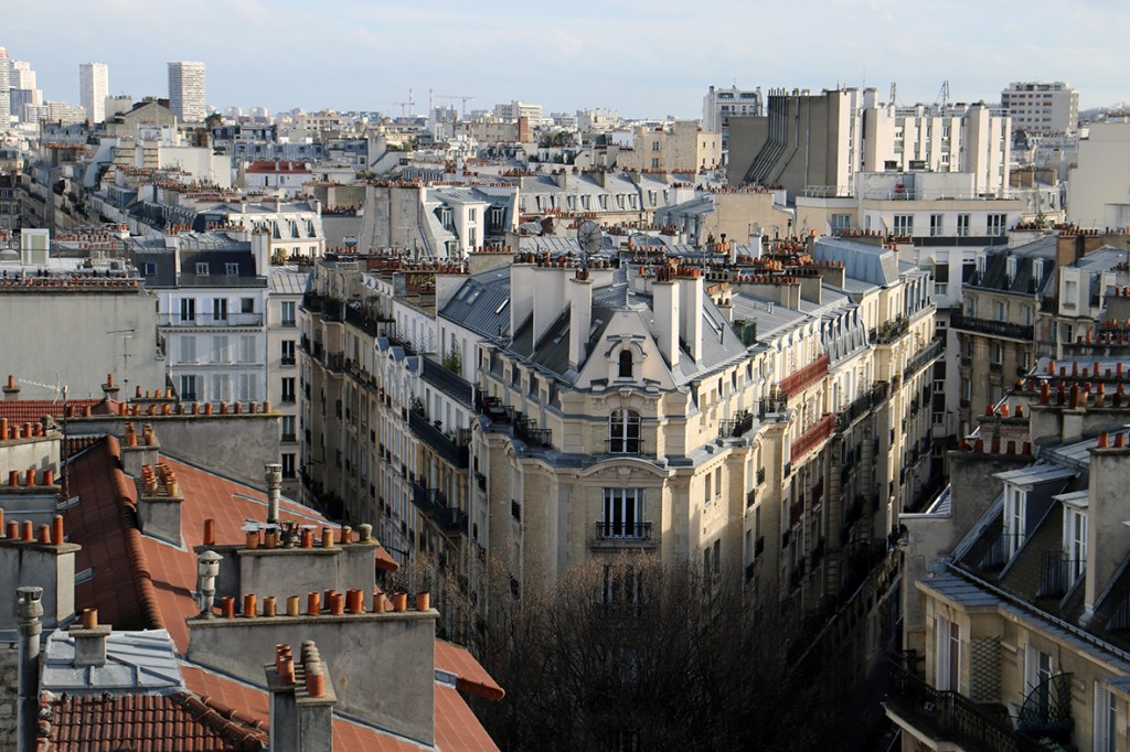Je profite de cette journée buissonnière pour rendre visite à V dans son appartement/atelier, au neuvième étage d’un immeuble du 14ème arrondissement. Une vue à couper le souffle, assieds toi à mon bureau, tu vas voir. Je lui envie cet espace, le désordre qu’elle y laisse.