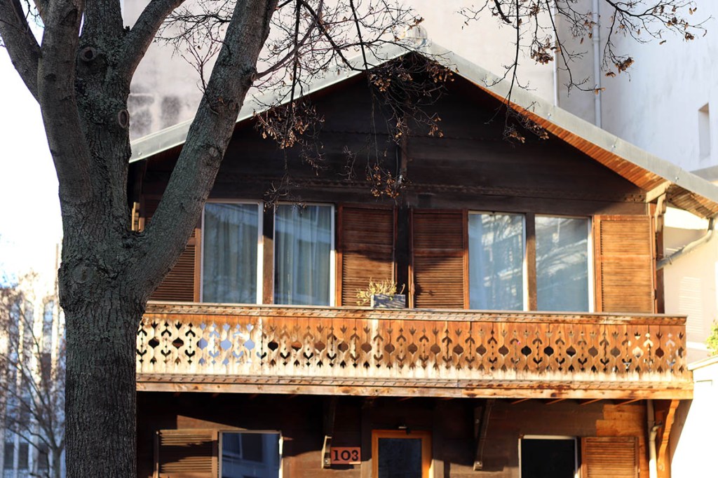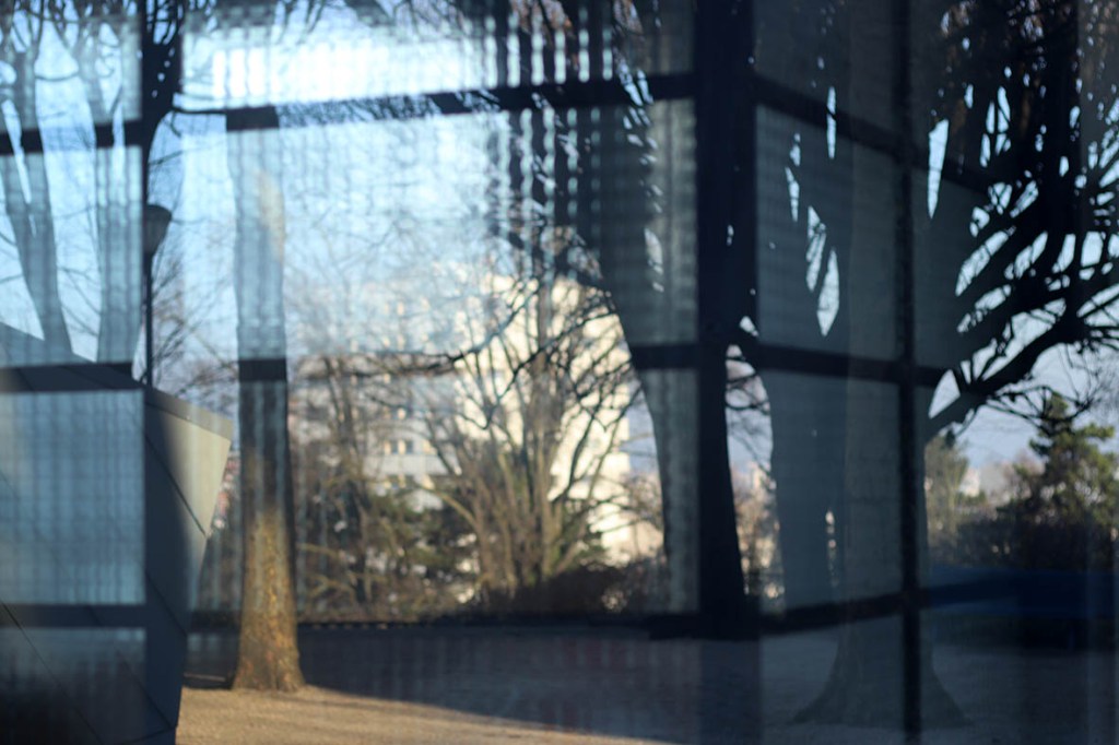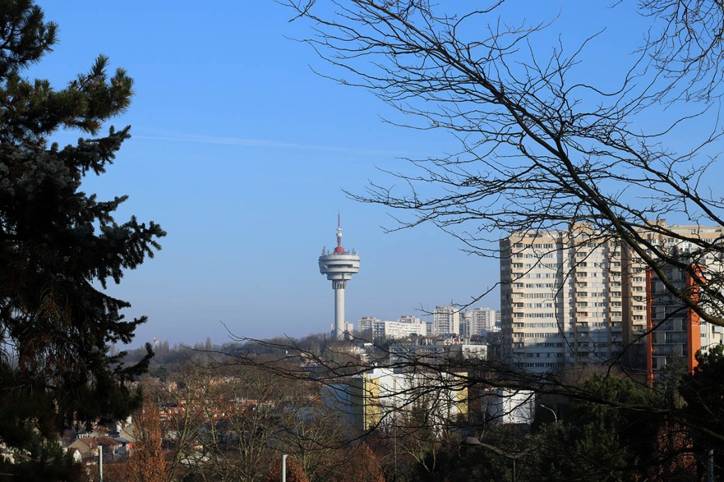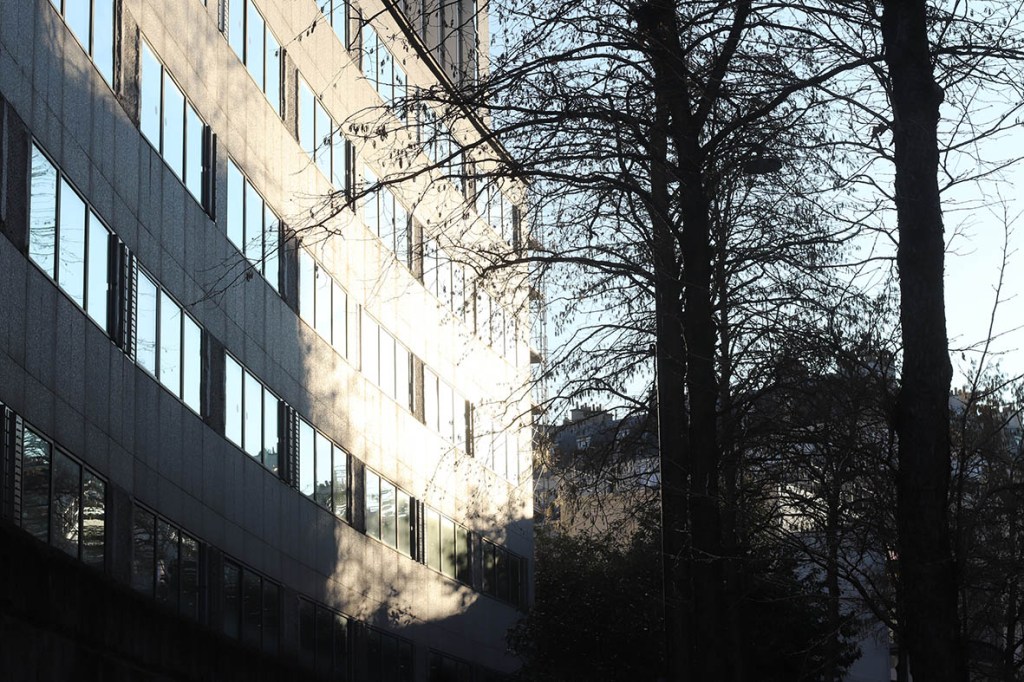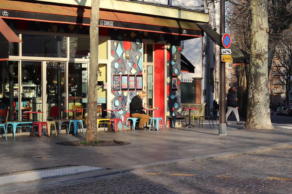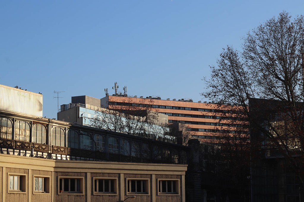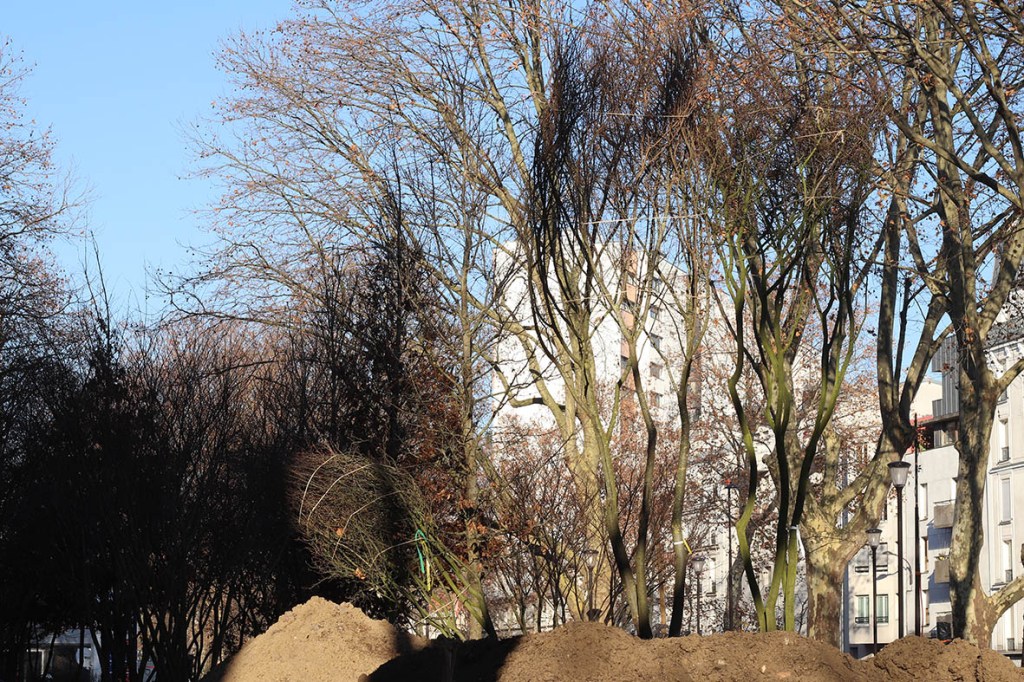 Nous marchons pour rejoindre le parc de la Butte du Chapeau Rouge. Beau soleil, froid glacial. Le parc est désert, un jardinier semble surpris de nous voir, nous salue, puis sa collègue qu’on aperçoit dans les buissons nous salue à son tour. Prendre de la hauteur. Les perspectives s’ouvrent dans la lumière tranchante et les arbres nus dialoguent avec la ville.
