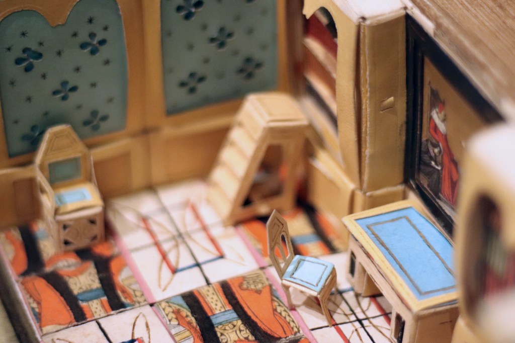 Visite en famille de la maison de Victor Hugo, place des Vosges. Dans la cage d’escalier, un vitrail représente un profil de femme dont les traits stylisés me rappellent les figures des cartes à jouer avec lesquelles je me racontais des histoires enfant, assise sur le tapis persan, un jardin merveilleux où rois, dames, valets se courtisaient pendant que les conversations adultes se fondaient au-dessus de la table du déjeuner. Je découvre que VH était un acheteur compulsif d’objets, peu soucieux de leur valeur, il s’attache surtout à leur étrangeté, leur beauté. Il les accumule, les détourne, les met en scène, saturant l’espace pour mettre en scène sa vision. Il y a également des photographies de Hauteville House, l’exposition tout entière est comme un appel à enfin concrétiser ce voyage. C’est la représentation d’une miniature que VH avait réalisée avec son amie Louise Bertin pour Léopoldine, Charles et François-Victor qui m’a attirée ici. Elle est bien là, dès l’entrée du parcours, fabriquée à partir de cartes à jouer, fascinante de minutie, on est bien au-dessous du un/douxième traditionellement utilisé pour les maisons de poupées. Et je me demande avec quels personnages, ou quel objet simulacre, les enfants jouaient.