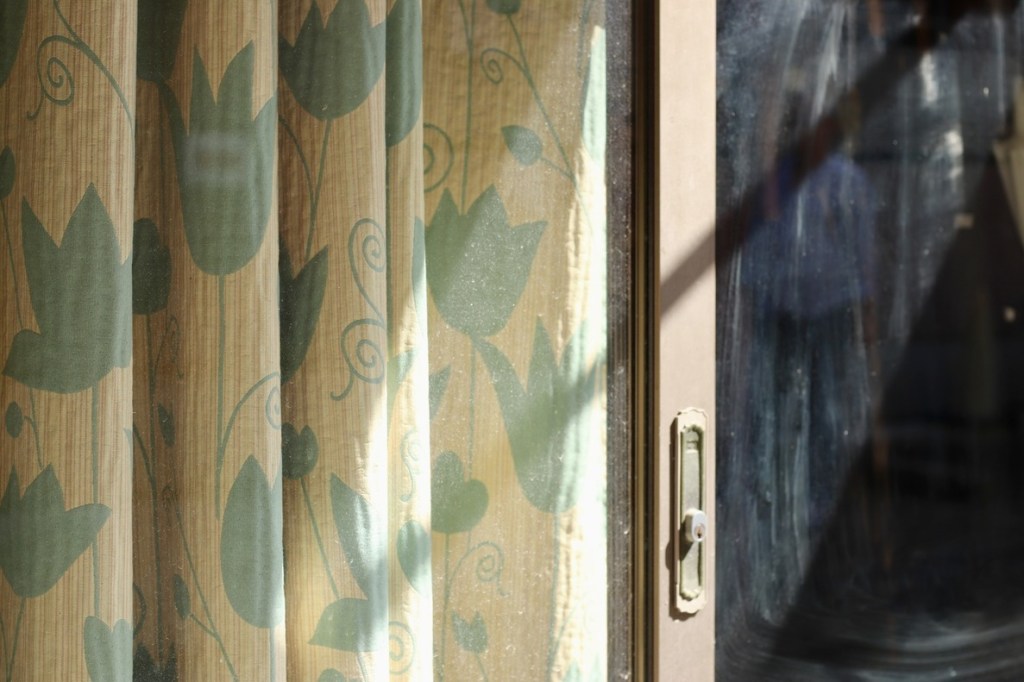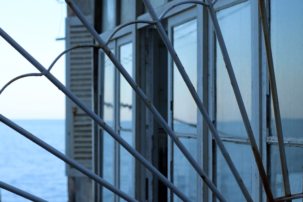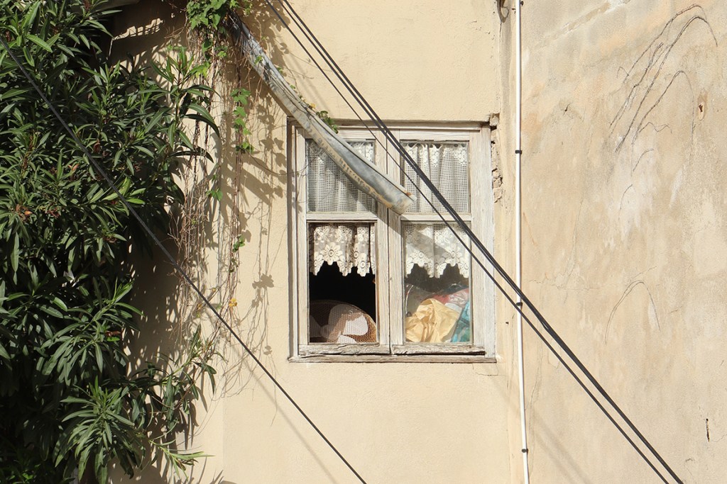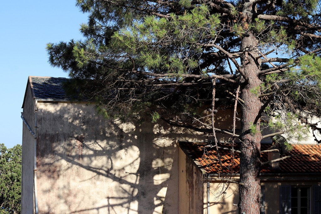 De l’autre côté de la ruelle il y a une construction qui me fascine. Une baie vitrée reflète le bleu du ciel et un pin immense, qui la protège. Et la petite fenêtre avec son carreau cassé, comme une invitation à entrer, la dentelle des rideaux à mi-hauteur, l’accumulation de linge coloré, le désordre est beau, porte une histoire, je pense à la photographier plusieurs fois mais la plupart du temps elle est dans l’ombre.