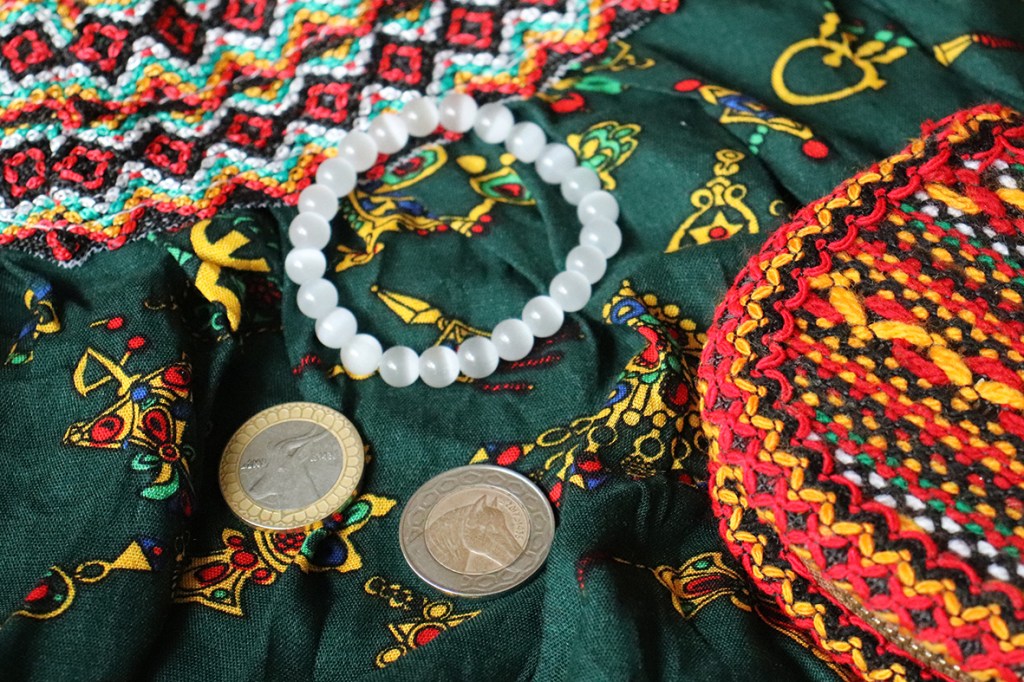 Je photographie les présents, une robe et un porte-monnaie kabyles rapportés par N, le bracelet de perles œil de chat que S a retiré de son poignet pour me le donner, cent cinquante dinars algériens, avec lesquels je pourrais acheter deux pains et un kilo d’oranges. La robe ne ressemble pas du tout à celles dont je me souviens dans l’enfance, mais les motifs me rappellent les bijoux en argent émaillé que N ne manquait pas de nous offrir quand elle nous rendait visite avant la guerre civile.