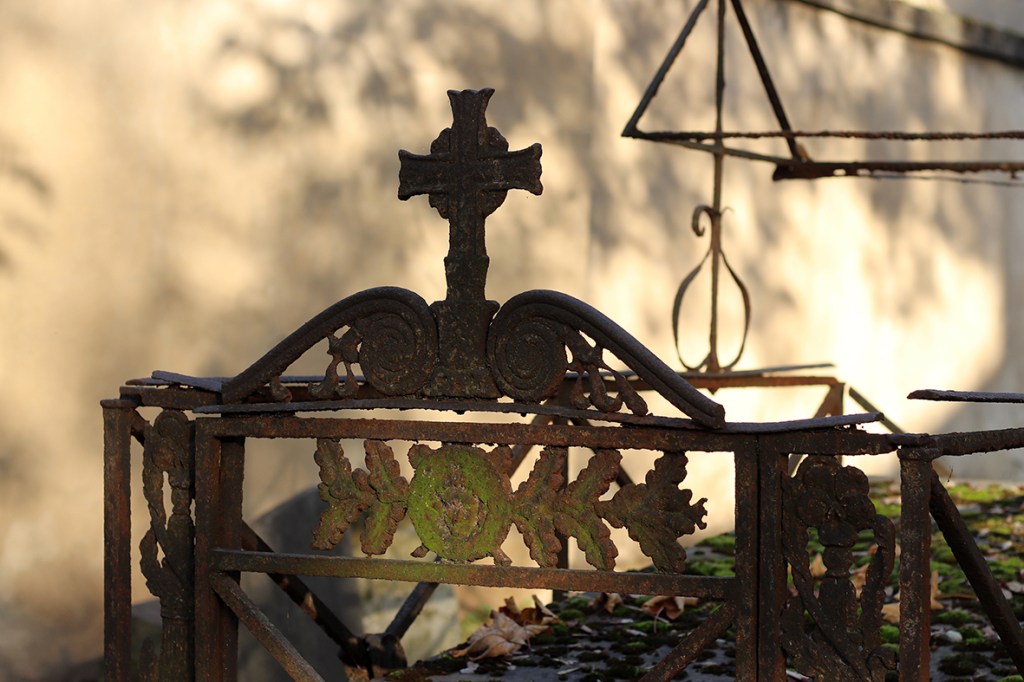 Je me souviens que le plus petit cimetière parisien est à Montmartre, c’est aussi le plus ancien, il n’ouvre qu’une fois par an, le 1er novembre, pour une fois je m’en souviens à temps. Le ciel mou s’éclaire. Derrière la vitre du restaurant l’homme déjeune seul, j’observe sa manière délicate de découper le poisson. On traverse la foule du Tertre. Devant l’église Saint-Pierre une file d’attente s’est déjà formée. On ne peut entrer dans le cimetière que par petits groupes, à l’invitation d’un guide, toutes les quinze minutes. Il y a le soleil qui s’accroche aux feuillages encore verts. Des personnes qui s’interrogent, pourquoi faisons-nous la queue ? Les cuivres rutilants de la buvette installée dans cour. Le bronze sculpté de la porte immense qui ferme l’accés au cimetière tous les autres jours de l’année. Il y a trois gardiens postés à l’entréee du cimetière, comme nous sommes maintenant en tête de file on plaisante avec eux, ne pas parler aurait été impoli. L’un d’eux m’offre un cannelé confectionné par une collègue. Notre guide se présente, nous la suivons dans le cimetière minuscule avec le sentiment d’être des privilégiés. Sa voix est tendue, son approche historique ennuyeuse, nous nous échappons discrètement. Il y a encore un peu de lumière sur les pierres usées, des moucherons volètent au-dessus des mousses, des vies minuscules. Je prends les seules photos de la semaine.