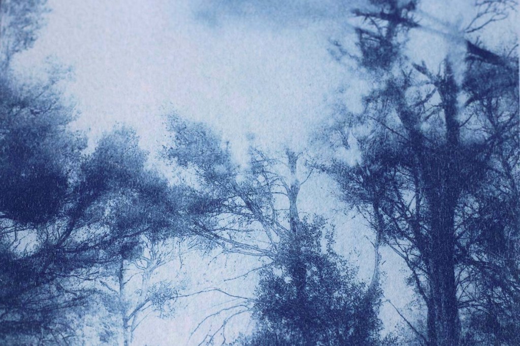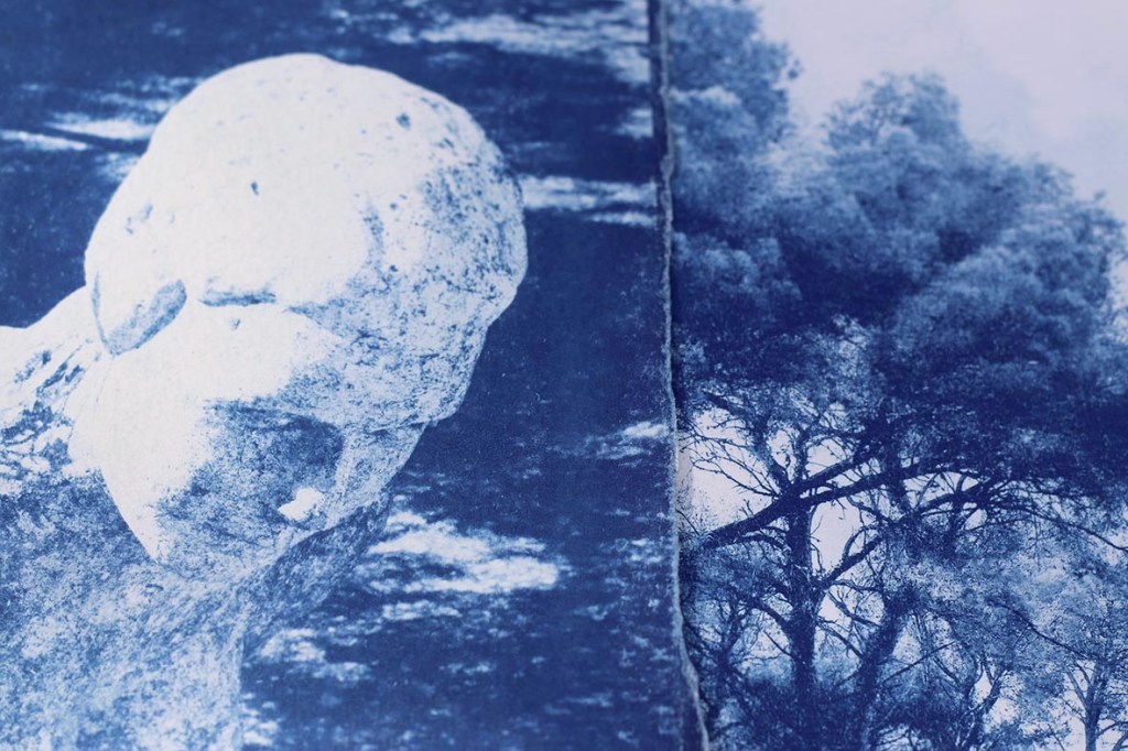 Profiter de la lumière pour réaliser quelques cyanotypes à partir des photographies prises parmi les pins, sur la terrasse, autour des statues. Je ne sais jamais à l’avance ce qui restera, quelle forme exacte prendra l’empreinte, et ce suspens redouble l’impression que tout fuit.