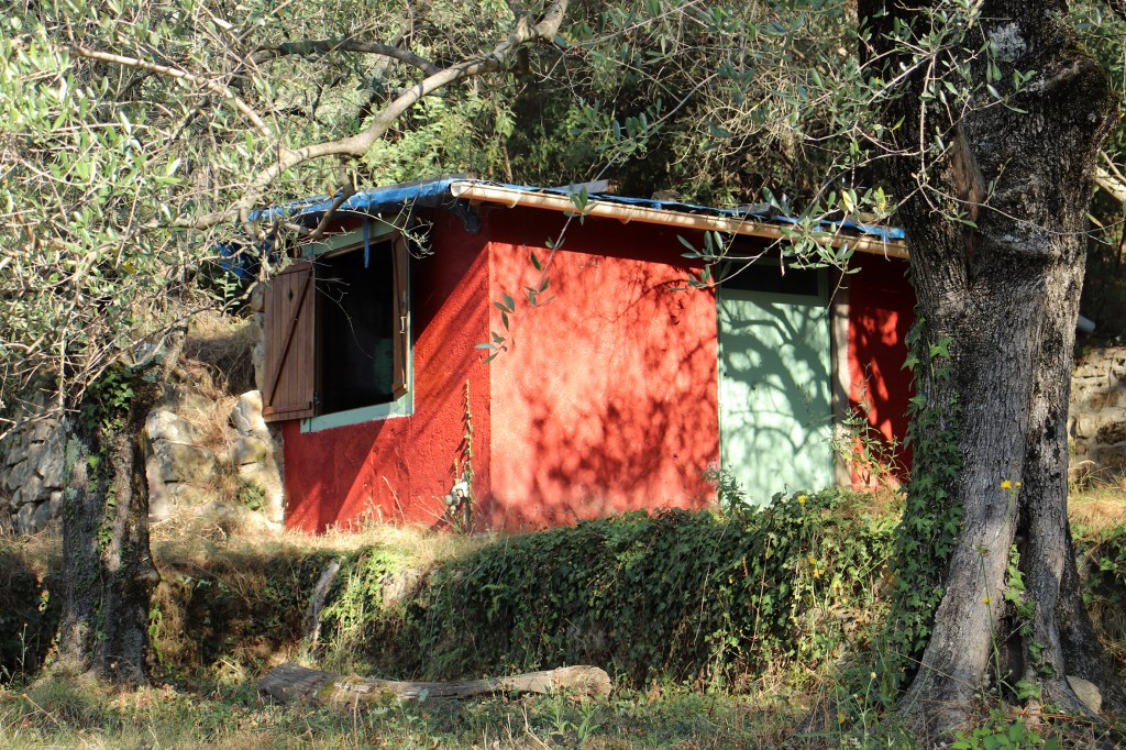 Se décider enfin à sortir l’appareil, arpenter les planches autour, cigales, oliviers, rejets, pierres, réminiscences, froissement d’herbes sèches sous les pieds, œil paresseux, peu de photos. Arriver à la campagne du dessus, A m’invite à boire un verre — de l’eau très bien merci — m’offre une pêche, elle évoque une chapelle à Saint-Antoine que je ne connais pas, promesse intérieure d’aller y faire un saut lors du prochain voyage en Corse, un frelon insistant met fin à notre échange. Dîner chez madame la maire et son époux, amis de mon amie, soupe au pistou et fromage furieux, discussion animée autour du projet de R d’interviewer les habitants de C : un film collecte de la mémoire du village.