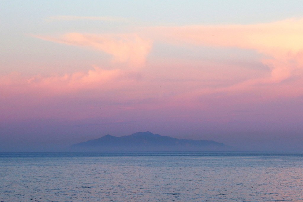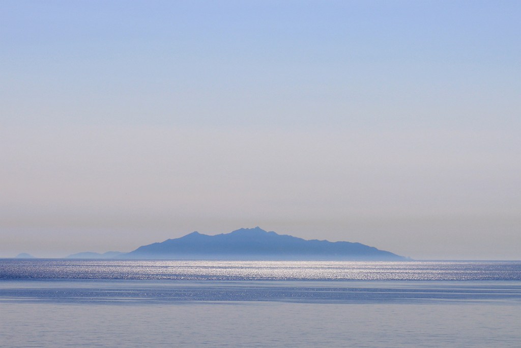 Le ciel vaporeux, trop clair, délavé d’un soleil haut / blanc /aveuglant. L’île d’Elbe dresse au lointain sa roche cobalt. Là où la terre rencontre l’eau, monte une brume légère, tremblante. Sous le soleil un écran de mica. Surgissent les silhouettes fragiles de fantômes endormis, attendre leurs chants. L’ombre effilée d’un nuage, sa marbrure froide sur la mer lisse, une ligne de sable ensevelit les drames.