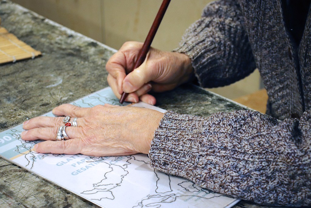 L porte un nouveau chandail tricoté par sa mère, pas de jacquard spectaculaire mais un savant jeu de points en relief. À la main gauche plusieurs bagues en argent que je n’avais pas remarquées auparavant. Elle travaille d’après une aquarelle qu’elle a peinte dans les Hautes-Alpes, Quand je regarde ce paysage ça me fait quelque chose, là — elle se frappe la poitrine—, Palpiter tu veux dire ? Oui c’est ça palpiter. Pourquoi ? C’est l’endroit où je suis née. Je réalise que je n’ai jamais peint sur le motif, j’aurais je crois l’impression de me perdre. Nous déjeunons ensemble, elle me raconte sa vie, La prochaine fois ce sera toi.