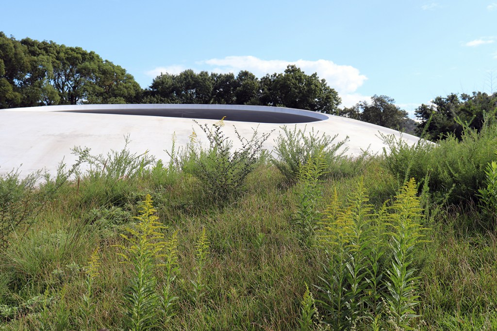 D’abord il y a un chemin qui serpente dans la nature intense, bruissante de chants d’oiseaux. A l’entrée de l’architecture, on recueille les consignes, les photographies sont interdites, sur le sol il y a des choses fragiles sur lesquelles vous ne devez pas marcher, merci de respecter le silence. Nous enlevons nos chaussures, nous entrons prudemment dans la coquille blanche. Nous sommes reliés au monde extérieur par deux ovales découpés dans la voûte qui laissent pénétrer l’air et la lumière. Le sol est parfaitement lisse, mais on perçoit des mouvements furtifs, de minuscules gouttes d’eau se forment à sa surface, surgissant de terre par d’invisibles ouvertures. Les gouttes glissent pour se rejoindre, elles forment des ruisseaux, des flaques, des constellations mouvantes, des archipels. On observe, souffle suspendu, un monde qui se fabrique sous nos yeux. Le temps s’arrête, nous enveloppe. On marche timidement entre les gouttes, les flaques, sans jamais se gêner les uns les autres, à pas de fourmis. On ne parle pas. On s’arrête, on fait corps avec l’œuvre vivante, entre ciel et terre. Je fais corps, des larmes se forment.